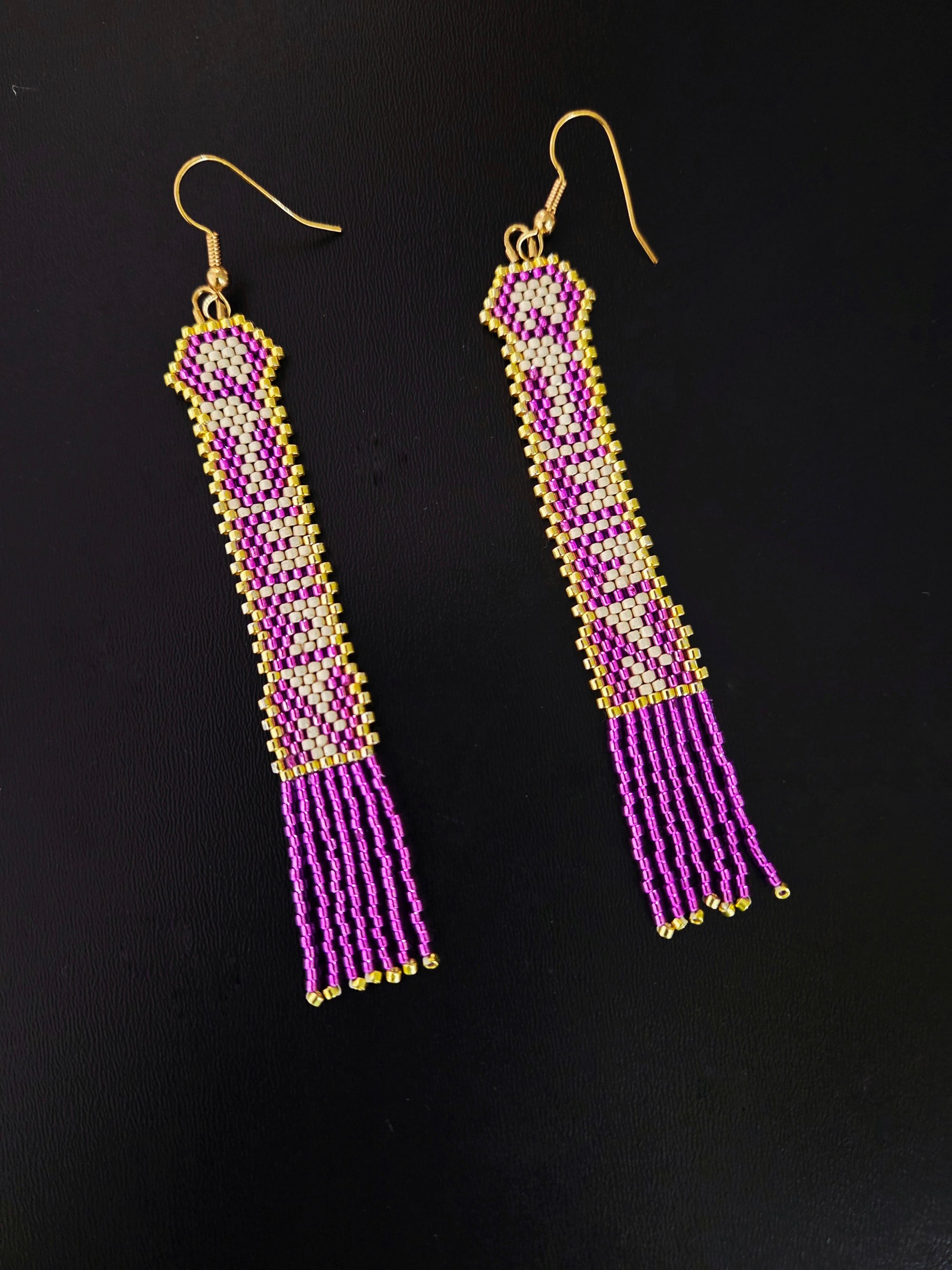 Remind yourself exactly who you are with these purple, gold, and linen colored fringe drop earrings that read "Queen".